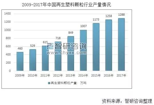 智研咨询发布的《2019-2025年中国废塑料回收行业市场运营模式分析及发展趋势预测研究报告》数据显示:近几年,我国再生塑料颗粒行业产量快速增长,从2009年的460万吨增长到2017年的1288万吨,近几年我国再生塑料颗粒行业产量情况如下图所示: